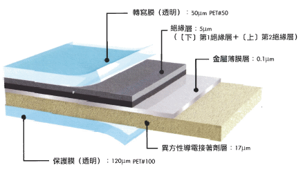 由转写膜,绝缘层,金属薄膜层,异方导电性接著剂层,离型膜构成。将独立开发的耐热性树脂用镀膜法在转写膜上形成的.此绝缘层由软性树脂层(第1绝缘层)和耐摩耗性树脂层(第2绝缘层)2层构成,实现了良好耐折次数.