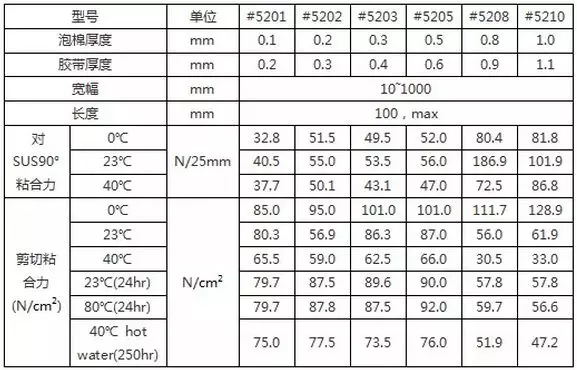 防水泡棉胶带#5200系列型号表:一般物性表